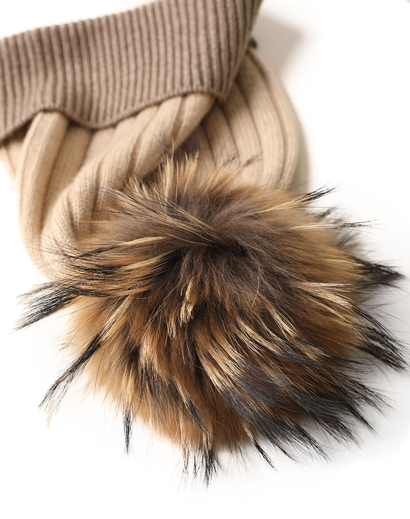 Dual-Color Rib Knit Cashmere Beanie with Pom Pom